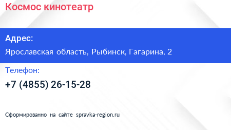 Космос, кинотеатр по адресу Ярославская область, Рыбинск, Гагарина, 2 в дальнейшем Организация, размещена в следующих категориях:
