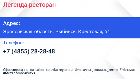Легенда, ресторан по адресу Ярославская область, Рыбинск, Крестовая, 51 в дальнейшем Организация, размещена в следующих категориях:
