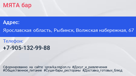 МЯТА, бар по адресу Ярославская область, Рыбинск, Волжская набережная, 67 в дальнейшем Организация, размещена в следующих категориях: