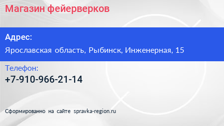 Магазин фейерверков по адресу Ярославская область, Рыбинск, Инженерная, 15 в дальнейшем Организация, размещена в следующих категориях: