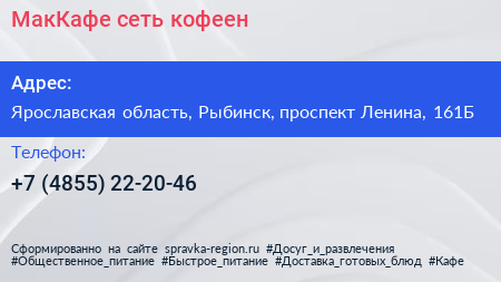 МакКафе, сеть кофеен по адресу Ярославская область, Рыбинск, проспект Ленина, 161Б в дальнейшем Организация, размещена в следующих категориях: