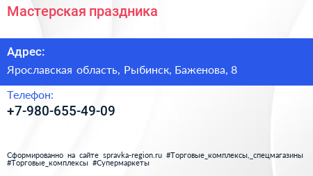 Мастерская праздника по адресу Ярославская область, Рыбинск, Баженова, 8 в дальнейшем Организация, размещена в следующих категориях: