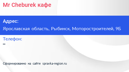Mr. Cheburek, кафе по адресу Ярославская область, Рыбинск, Моторостроителей, 9Б в дальнейшем Организация, размещена в следующих категориях: