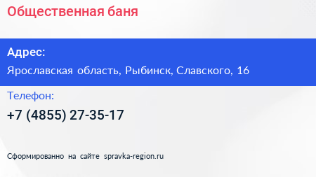 Общественная баня по адресу Ярославская область, Рыбинск, Славского, 16 в дальнейшем Организация, размещена в следующих категориях: