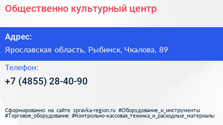 Общественно-культурный центр по адресу Ярославская область, Рыбинск, Чкалова, 89 в дальнейшем Организация, размещена в следующих категориях: