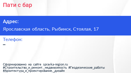 Пати`с, бар по адресу Ярославская область, Рыбинск, Стоялая, 17 в дальнейшем Организация, размещена в следующих категориях:
