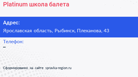 Platinum, школа балета по адресу Ярославская область, Рыбинск, Плеханова, 43 в дальнейшем Организация, размещена в следующих категориях: