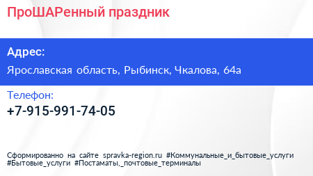 ПроШАРенный праздник по адресу Ярославская область, Рыбинск, Чкалова, 64а в дальнейшем Организация, размещена в следующих категориях: