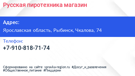 Русская пиротехника, магазин по адресу Ярославская область, Рыбинск, Чкалова, 74 в дальнейшем Организация, размещена в следующих категориях: