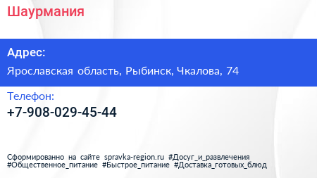 Шаурмания по адресу Ярославская область, Рыбинск, Чкалова, 74 в дальнейшем Организация, размещена в следующих категориях: