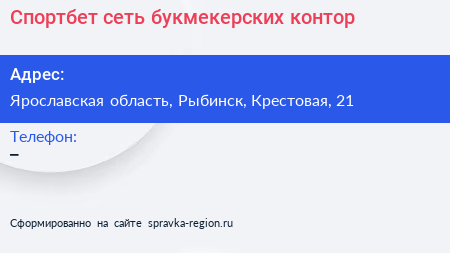 Спортбет, сеть букмекерских контор по адресу Ярославская область, Рыбинск, Крестовая, 21 в дальнейшем Организация, размещена в следующих категориях: