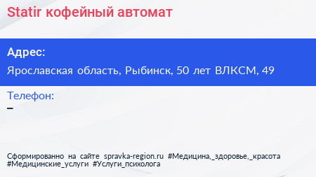 Statir, кофейный автомат по адресу Ярославская область, Рыбинск, 50 лет ВЛКСМ, 49 в дальнейшем Организация, размещена в следующих категориях: