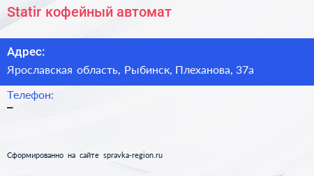 Statir, кофейный автомат по адресу Ярославская область, Рыбинск, Плеханова, 37а в дальнейшем Организация, размещена в следующих категориях: