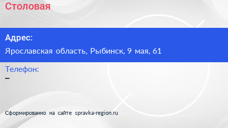 Столовая по адресу Ярославская область, Рыбинск, 9 мая, 61 в дальнейшем Организация, размещена в следующих категориях:
