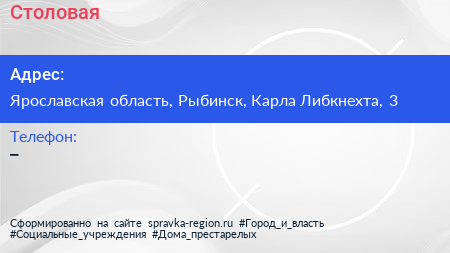 Столовая по адресу Ярославская область, Рыбинск, Карла Либкнехта, 3 в дальнейшем Организация, размещена в следующих категориях: