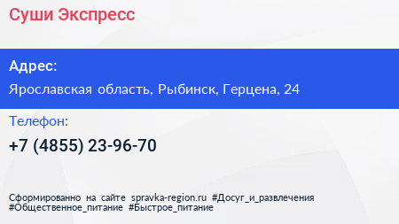 Суши Экспресс по адресу Ярославская область, Рыбинск, Герцена, 24 в дальнейшем Организация, размещена в следующих категориях: