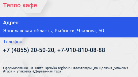 Тепло, кафе по адресу Ярославская область, Рыбинск, Чкалова, 60 в дальнейшем Организация, размещена в следующих категориях: