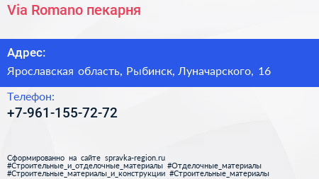 Via Romano, пекарня по адресу Ярославская область, Рыбинск, Луначарского, 16 в дальнейшем Организация, размещена в следующих категориях: