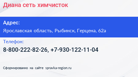 Диана, сеть химчисток по адресу Ярославская область, Рыбинск, Герцена, 62а в дальнейшем Организация, размещена в следующих категориях: