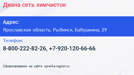 Диана, сеть химчисток по адресу Ярославская область, Рыбинск, Бабушкина, 29 в дальнейшем Организация, размещена в следующих категориях: