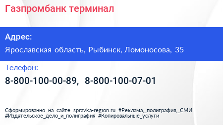 Газпромбанк, терминал по адресу Ярославская область, Рыбинск, Ломоносова, 35 в дальнейшем Организация, размещена в следующих категориях: