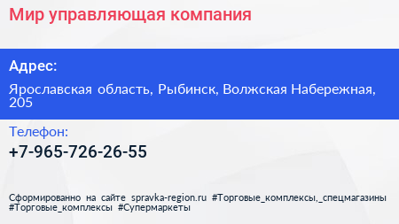 Мир, управляющая компания по адресу Ярославская область, Рыбинск, Волжская Набережная, 205 в дальнейшем Организация, размещена в следующих категориях: