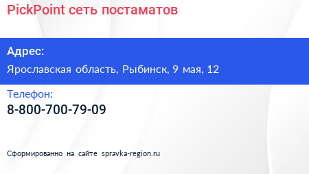 PickPoint, сеть постаматов по адресу Ярославская область, Рыбинск, 9 мая, 12 в дальнейшем Организация, размещена в следующих категориях: