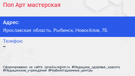 Поп Арт, мастерская по адресу Ярославская область, Рыбинск, Новосёлов, 7Б в дальнейшем Организация, размещена в следующих категориях: