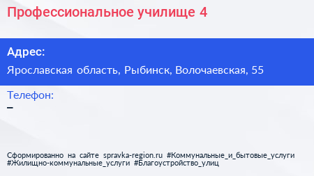Профессиональное училище №4 по адресу Ярославская область, Рыбинск, Волочаевская, 55 в дальнейшем Организация, размещена в следующих категориях: