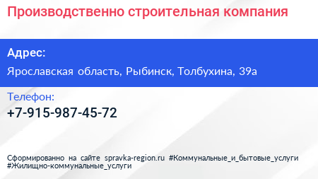 Производственно-строительная компания по адресу Ярославская область, Рыбинск, Толбухина, 39а в дальнейшем Организация, размещена в следующих категориях:
