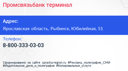 Промсвязьбанк, терминал по адресу Ярославская область, Рыбинск, Юбилейная, 51 в дальнейшем Организация, размещена в следующих категориях: