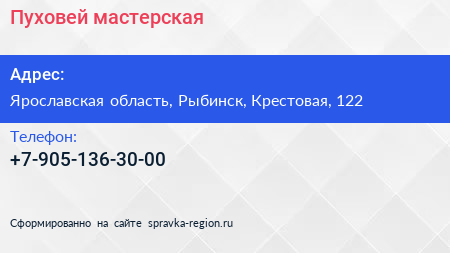 Пуховей, мастерская по адресу Ярославская область, Рыбинск, Крестовая, 122 в дальнейшем Организация, размещена в следующих категориях: