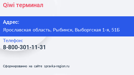 Qiwi, терминал по адресу Ярославская область, Рыбинск, Выборгская 1-я, 51Б в дальнейшем Организация, размещена в следующих категориях: