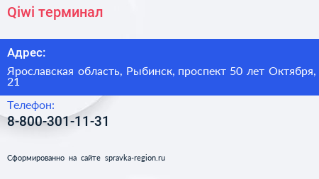 Qiwi, терминал по адресу Ярославская область, Рыбинск, проспект 50 лет Октября, 21 в дальнейшем Организация, размещена в следующих категориях: