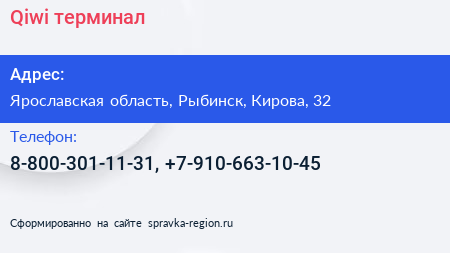 Qiwi, терминал по адресу Ярославская область, Рыбинск, Кирова, 32 в дальнейшем Организация, размещена в следующих категориях: