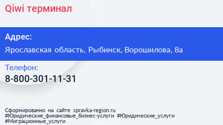 Qiwi, терминал по адресу Ярославская область, Рыбинск, Ворошилова, 8а в дальнейшем Организация, размещена в следующих категориях: