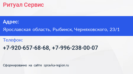 Ритуал Сервис по адресу Ярославская область, Рыбинск, Черняховского, 23/1 в дальнейшем Организация, размещена в следующих категориях: