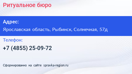 Ритуальное бюро по адресу Ярославская область, Рыбинск, Солнечная, 57д в дальнейшем Организация, размещена в следующих категориях: