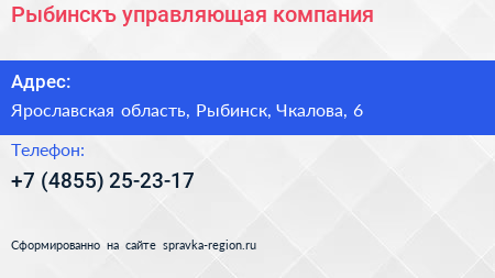 Рыбинскъ, управляющая компания по адресу Ярославская область, Рыбинск, Чкалова, 6 в дальнейшем Организация, размещена в следующих категориях: