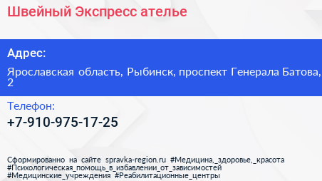 Швейный Экспресс, ателье по адресу Ярославская область, Рыбинск, проспект Генерала Батова, 2 в дальнейшем Организация, размещена в следующих категориях: