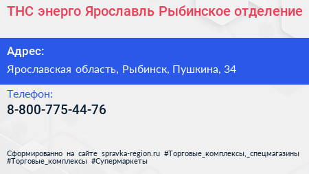 ТНС энерго Ярославль, Рыбинское отделение по адресу Ярославская область, Рыбинск, Пушкина, 34 в дальнейшем Организация, размещена в следующих категориях: