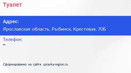 Туалет по адресу Ярославская область, Рыбинск, Крестовая, 70Б в дальнейшем Организация, размещена в следующих категориях: