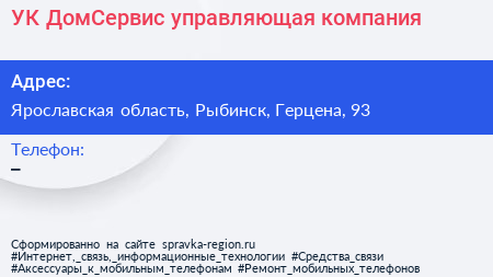 УК ДомСервис, управляющая компания по адресу Ярославская область, Рыбинск, Герцена, 93 в дальнейшем Организация, размещена в следующих категориях: