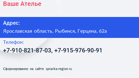 Ваше Ателье по адресу Ярославская область, Рыбинск, Герцена, 62а в дальнейшем Организация, размещена в следующих категориях: