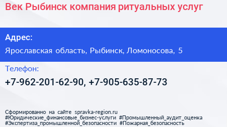 Век-Рыбинск, компания ритуальных услуг по адресу Ярославская область, Рыбинск, Ломоносова, 5 в дальнейшем Организация, размещена в следующих категориях: