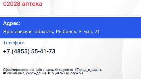 02028, аптека по адресу Ярославская область, Рыбинск, 9 мая, 21 в дальнейшем Организация, размещена в следующих категориях: