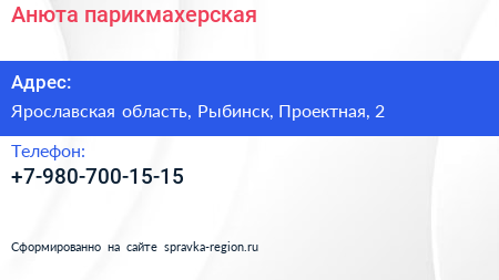 Анюта, парикмахерская по адресу Ярославская область, Рыбинск, Проектная, 2 в дальнейшем Организация, размещена в следующих категориях: