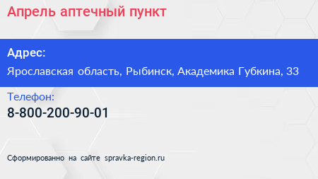 Апрель, аптечный пункт по адресу Ярославская область, Рыбинск, Академика Губкина, 33 в дальнейшем Организация, размещена в следующих категориях: