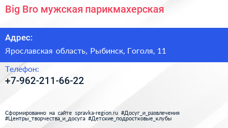 Big Bro, мужская парикмахерская по адресу Ярославская область, Рыбинск, Гоголя, 11 в дальнейшем Организация, размещена в следующих категориях: