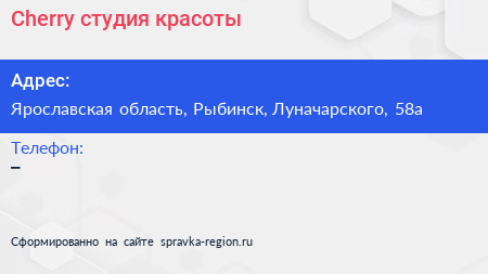 Cherry, студия красоты по адресу Ярославская область, Рыбинск, Луначарского, 58а в дальнейшем Организация, размещена в следующих категориях: